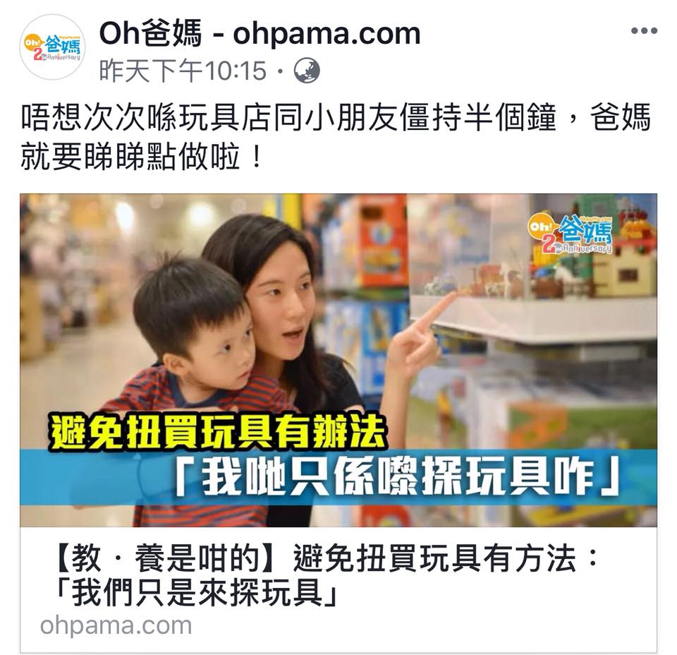 家長:真係幾靚喎!雖然我明白你好想要,但你記唔記得屋企已經有差唔多嘅,咁屋企個件點算?如果你真係要買,咁就當你先買生日禮物,生日時唔再買,你自己選擇?(讓孩子參與選擇,解決問題,同時訓練孩子分析、決策、控制、延後慾望及承擔後果的能力)