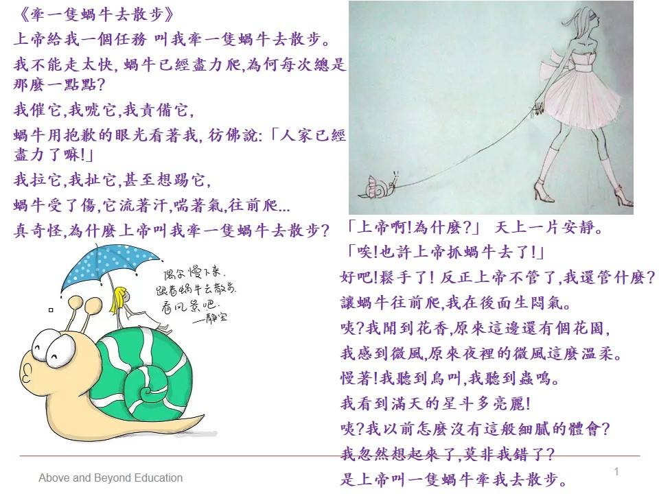 ——-送給所有正處於忙碌中、對孩子的耐性消弭了,對父母的角色感迷失,或在動孩子氣的家長,請讀讀這故事:《牽一隻蝸牛去散步》