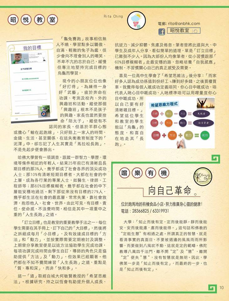「訂立目標」也是教室的重要教學手法之一,每位學生需要在其手冊上,訂下自己的「大目標」,然後將之拆細成每月「小目標」,及有效達成目標的「方法」和「動力」,並按實際需要定期檢討及調整。上期曾分享教室便是以這方法協助學生完成功課,每項功課完成時間由學生自訂,導師的角色只是協助提供「方法」及「動力」,效果顯著。他們都在不知不覺間練習「人生長跑」之道,重點是「質、專和深」,而非「快和多」。