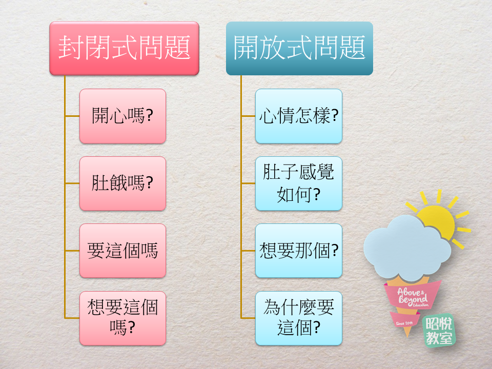 開放式語言有助鍛煉孩子的大腦、增加自我了解,及培養獨立思考、解難、溝通、表達、分析及決斷能力,並可讓他明白日後要為自己的選擇/行為承擔後果。