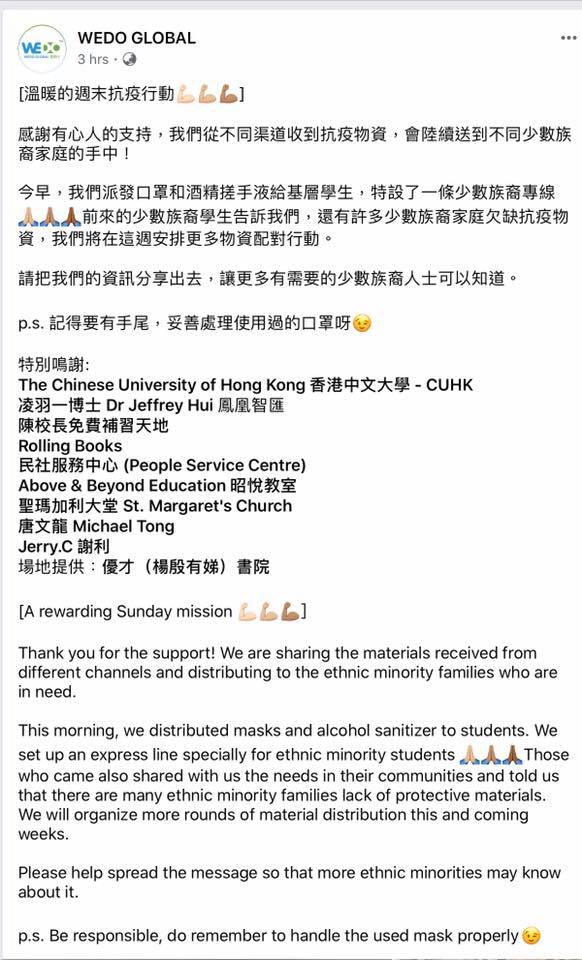 頭炮是透過友好機構 WEDO GLOBAL 向少數族裔學生送出1000個口罩,辛苦晒🙏🏻