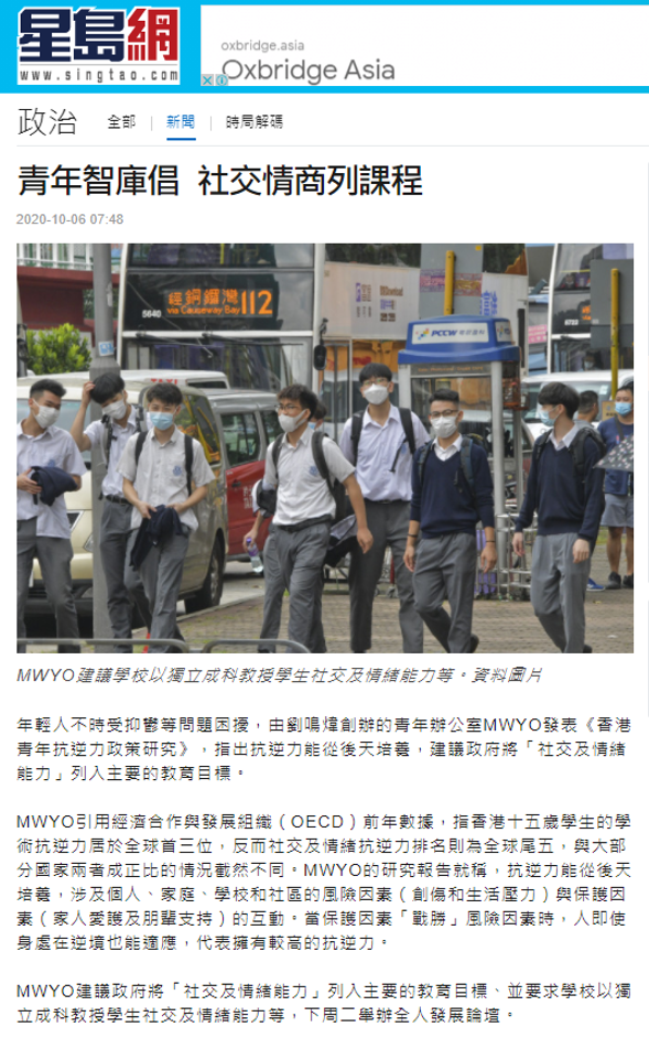 #MWYO 的最新研究報告,根據經濟合作與發展組織(OECD)前年數據,發現香港十五歲學生的學術抗逆力居於全球首三位,反而社交及情緒抗逆力排名則為全球尾五,與大部分國家兩者成正比的情況截然不同。 所以唔好睇小教室嘅 #社交及情緒教育( #SocialEmotionalLearning 簡稱 #SEL) 課程!有完成課程的學生家長表示:「你比咗好寶貴嘅課程給孩子,終身受用,也給媽媽上咗寶貴嘅一堂」 教室亦有幸為呢個研究提供咗丁點意見,報告全文可見https://www.mwyo.org/assets/docs/SEL/MWYO_SEL_Oct2020_A6.pdf 期待報告建議「教授學生社交及情緒能力成為學校的指定科目」會有一天成真(無咩嘢都係出返去發住夢先)